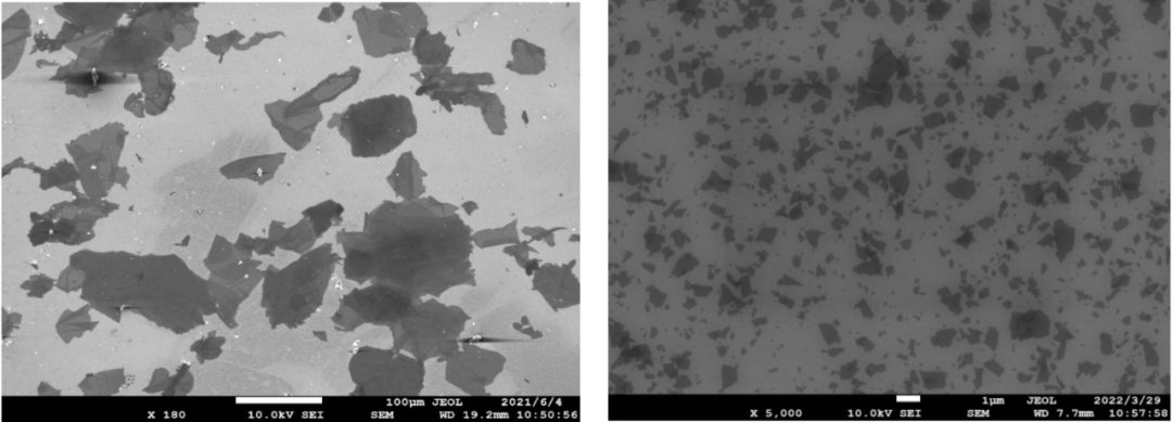 氧化石墨烯的規(guī)模生產(chǎn)是石墨烯產(chǎn)品應(yīng)用的重要基礎(chǔ)和先決條件,其品質(zhì)決定了石墨烯應(yīng)用產(chǎn)品的性能。墨�?萍寄壳熬邆涫褂没瘜W(xué)-氧化還原法生產(chǎn)高品質(zhì)氧化石墨烯能力,產(chǎn)能高達(dá)1000噸/年,處于國內(nèi)領(lǐng)先水平。在此基礎(chǔ)上,墨�?萍疾粩喔倪M(jìn)工藝,調(diào)控石墨烯的品質(zhì),實現(xiàn)定制化生產(chǎn)氧化石墨烯,以滿足下游不同的應(yīng)用場景需求。品質(zhì)調(diào)控主要可分為片層尺寸、厚度大小、官能團(tuán)(碳氧比)含量以及片層完整性控制。為了實現(xiàn)氧化石墨烯片徑尺寸的宏觀調(diào)控,墨�?萍甲灾餮邪l(fā)了行業(yè)領(lǐng)先的生產(chǎn)設(shè)備,并通過結(jié)合實際生產(chǎn)情況對片徑可控的制備機(jī)理進(jìn)行深入研究與實踐。墨睿研發(fā)團(tuán)隊在制備過程中對石墨原料進(jìn)行改性處理,嚴(yán)格控制各階段反應(yīng)溫度,從而實現(xiàn)大片徑氧化石墨烯的宏量制備,掃描電鏡(SEM)結(jié)果如圖3所示,大片徑氧化石墨烯材料表面光滑,材料邊緣部分呈現(xiàn)褶皺狀態(tài),邊界呈不規(guī)則片層,片徑大小主要分布在50-120μm。采用激光粒度儀重復(fù)驗證,其粒徑分布范圍為26.043-199.904μm,D50為98.644μm,最高體積占比為11%左右,與SEM檢測結(jié)果一致。墨睿科技團(tuán)隊還開發(fā)了小片徑氧化石墨烯宏量制備工藝。在制備過程中采用獨特的雙向剪切技術(shù)獲得片徑1微米左右的氧化石墨烯,結(jié)果如圖4所示。